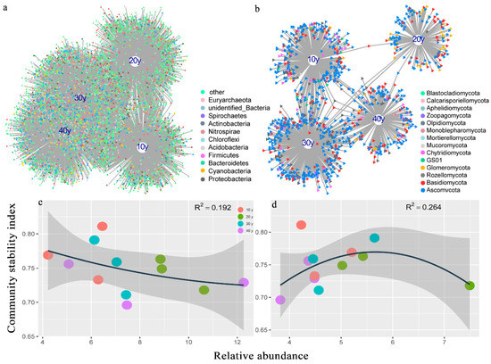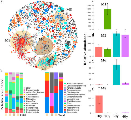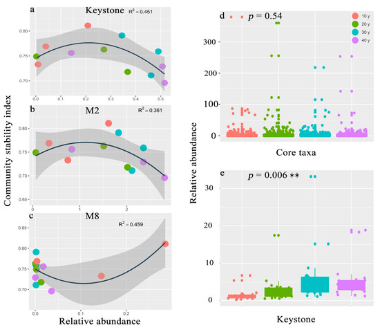 There were 2394 (1510 bacteria and 884 fungi) nodes in the co-occurrence networks, and the connections between and within bacteria and fungi are shown in Figure 4a. The network width was 5.31, and most connections appeared in the bacterial assemblages. However, the core taxa were found in the MON, and we discovered that they agglomerated by module. We selected the top four in the relative abundance of core taxa of modules in the MON (Figure 4a). The results indicated that the core taxa differed among recovery times. For example, in M2 (342 bacteria and 0 fungi), relatively high abundance and strong connections of core taxa were observed in the 30 y and 40 y restoration periods, while in M6 (84 bacteria and 6 fungi), M1 (104 bacteria and 90 fungi) and M8 (63 bacteria and 6 fungi), the highest abundance of core taxa occurred in the 30 y, 20 y and 10 y restoration periods, respectively (Figure 4c–f; Table S6). The most abundant core bacterial taxa were Proteobacteria, Cyanobacteria, Bacteroidetes, Firmicutes and Acidobacteria, and the core taxa of fungi were Ascomycota, Basidiomycota, Rozellomycota and Glomeromycota (Figure 4b). However, there were 22 bacterial keystone species and no fungal keystone species in the MON, and the abundance of keystone species significantly increased with increasing recovery times (p = 0.006) (Figure 5e). The bacterial keystone species belonged to Proteobacteria, Nitrospirae, Acidobacteria, Chloroflexi, Spirochaetes, Bacteroidetes, Latescibacteria, and Euryarchaeota. (Table S7). Moreover, the relationships between assemblage stability and the relative abundances of core taxa and keystone species were analyzed in this study, and the results suggested that the keystone species helped promote the stability of the microbial assemblages (R2 = 0.451) (Figure 5a). In addition, the core taxa of M2 displayed a higher abundance in the relatively long periods, which enhanced assemblage stability (R2 = 0.361) (Figure 5b). However, the core taxa of M8 with high abundance in the 10 y restoration period did not improve assemblage stability (Figure 5c).
