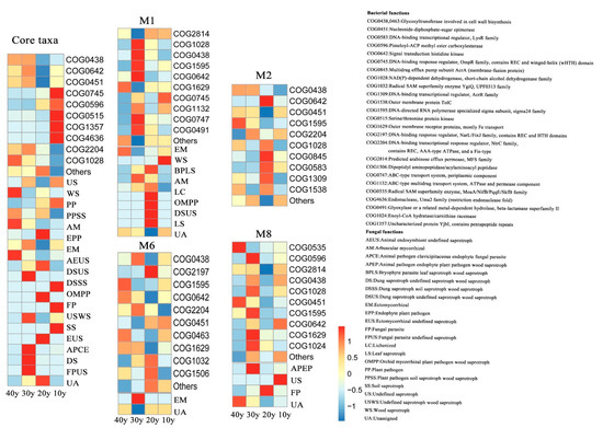 Bacterial and fungal functional predictions for the core microbiota as annotated by PICRUSt 2 and FUNGuild. (Core taxa, M1, M2, M6 and M8).