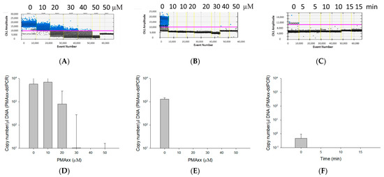 The effect of different concentrations of propidium monoazide (PMAxx) (A,B,D,E) and different LED light exposure times (C,F). The yellow vertical dotted lines separate results of individual reaction wells (A–C). DNA copy number obtained by ddPCR after exposing live (D) and dead (E) B. cenocepacia J2315 (1.5 × 108 CFU/mL) cells to different PMAxx concentrations (0, 10, 20, 30, 40, and 50 μM PMAxx). DNA copy number obtained by ddPCR after exposing dead B. cenocepacia J2315 (1.5 × 108 CFU/mL) to different LED light exposure times (0, 5, 10, and 20 min) (F).
