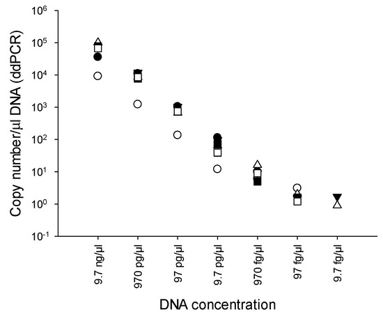 Limit of detection (LOD) of the PMAxx-ddPCR assay. DNA concentrations of the undiluted DNA samples (97 ng/μL) were spectrophotometrically determined at A260.
