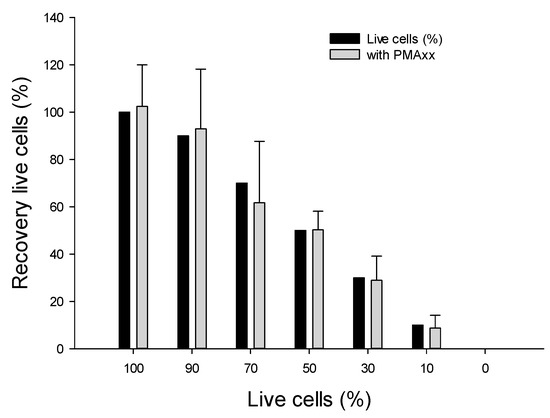 We assessed the effectiveness of the PMAxx-ddPCR assay using the optimal condition of 10 µM PMAxx and 5 min of LED light exposure, as described earlier. A mixture of viable and dead cells corresponding to 100, 90, 70, 50, 30, 10, and 0% (live/dead ratios) were subjected to the PMAxx-ddPCR assay (Figure 3). The 100% viable cells were 102.4 ± 17.6% (average 5368 copy number/µL DNA). Based on these results, the ratio was calculated relatively in comparison with 100% viable cells. The calculated recovery rates of the mixtures with 90% and 70% live/dead ratios in the PMAxx-ddPCR assay were 92.8% (4986 copy number/µL DNA), and 61.7% (3311.4 copy number/µL DNA), respectively. The recovery rates of mixtures with 50, 30, and 10% live/dead ratios in the PMAxx-ddPCR assay were found to be 50.3% (2698 copy number/µL DNA), 28.9% (1552.8 copy number/µL DNA), and 8.7% (467 copy number/µL DNA), respectively. The mean recovery percentage of live cells decreased gradually with increasing proportion of dead cells. This indicates that the DNA from dead cells was effectively inactivated by PMAxx treatment. Indeed, control samples consisting of PMAxx™-treated dead cells (0% live cells) yielded no detectable signal with ddPCR. Therefore, the PMAxx-ddPCR assay accurately detected viable cells from mixtures of viable and non-viable cells. False positive amplifications remained very limited.