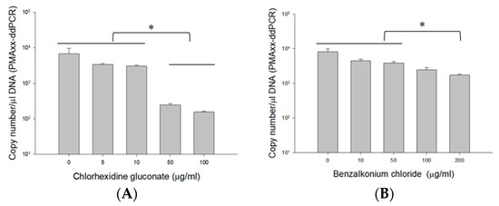 DNA copy number obtained by ddPCR in live B. cenocepacia J2315 (1.5 × 108 CFU/mL) cells efficiency of suspensions spiked with 5, 10, 50, 100 µg/mL CHX (A), and 10, 50, 100, 200 µg/mL BZK (B). Error bars in diagrams represent the mean value ± standard deviations obtained in triplicates. The * symbol over each diagram indicates a statistically significant difference, p < 0.05.
