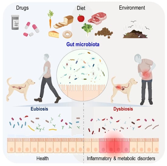 The gut microbiota is essential in the gastrointestinal homeostasis of animals and humans. Numerous studies have reported an association between the imbalances in the intestinal microbial ecosystem of pets and humans, also known as dysbiosis, with the presence of several inflammatory and endocrine diseases. The gut microbiota is also involved in extraintestinal diseases such as obesity, atopic dermatitis and diabetes mellitus [49].