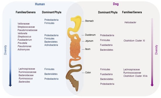 It is widely known that the gut microbiota varies along the gastrointestinal tract [32]. The particularity of each region of the GI tract, such as the acidic nature of the stomach, the profile of bile acids and enzyme richness in the small intestine and the low oxygen availability in the colon, have a great impact on which microbiota species colonize each segment [32,33]. In dogs, most reports focus on the analysis of fecal microbiota due to the practical difficulties and ethical constraints related to sample collection from each intestinal compartment in privately owned animals [28,29]. Suchodolski et al. evaluated the microbial communities of the duodenal, jejunal, ileal and colonic digesta of healthy dogs through 16S rRNA gene analysis [33]. Firmicutes, Fusobacteria, Bacteroidetes and Proteobacteria were the predominant phyla from the four sites, and there was a gradual increase in bacterial diversity along the gastrointestinal tract from the duodenum to the colon [30]. Similarly, Honneffer et al. analyzed the contents of the duodenum, ileum, colon and rectum from six healthy dogs via Illumina sequencing of 16S rRNA genes [34]. In addition to the four previously mentioned phyla, Actinobacteria was identified but contributed minimally in each segment [32].