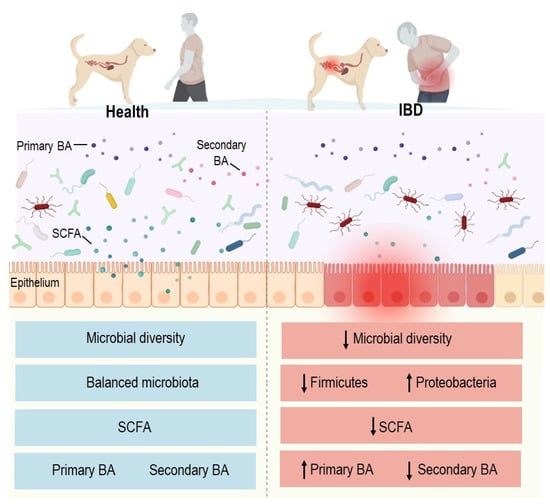 Humans and pet dogs show similar gut microbiota disturbances during IBD, characterized by a reduction in microbial diversity, a reduction in Firmicutes and an increase in Proteobacteria; a reduction in short-chain fatty acids (SCFAs); an increase in primary bile acids (BAs); and a reduction in secondary BAs.
