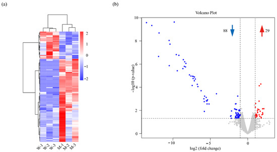 Overview of the differential expression genes in NC7401 and NC7401-ΔPf. (a) Heatmap of the differential expression genes. Hierarchical clustering diagram of all the differential expression genes was created based on RPKM. Blue and red indicate genes expressed at low and high levels, respectively. (b) Volcano plot of the differential expression genes. Grey dots indicate genes with no differential expression whereas blue and red dots represent the downregulated and upregulated genes, respectively.