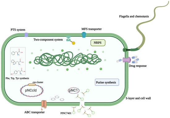 In total, 28 upregulated and 46 downregulated genes were in the chromosome (Table S4). A KEGG pathway analysis indicated that the downregulated genes were involved in the biosynthesis of a siderophore group of non-ribosomal peptides and ABC transporters whereas the upregulated genes were for phenylalanine, tyrosine, and tryptophan biosynthesis as well as the biosynthesis of amino acids (Figure S2). This was in line with the GO-enriched gene function analysis (Figure S3). These differentially expressed genes could be mainly involved in different function classifications, including the two-component signal transduction system, bacterial structure, transporters, related antibiotic response, purine biosynthesis, related NRPS and secondary metabolites, and aromatic or other amino acid synthesis (Table S5, Figure 3). Generally, the knock-out of even only one or several important chromosomal gene(s) may cause transcriptional changes in hundreds of genes. The curing of the complete PfNC7401, however, caused much fewer changes. It indicated that PfNC7401 was an independent episome.