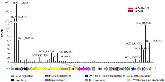 We did not find any gene encoded by PfNC7401 that was transcribed into the cured strain. For the wild strain itself, 39 genes of PfNC7401 displayed different transcriptional levels, of which 4 and 12 showed high and moderate expression levels whereas 23 showed low expression levels (Table S6). These genes are involved in plasmid replication (BCN_RS28465, BCN_RS28745–BCN_RS28750) and partition (BCN_RS28470), lysogenic-related (BCN_RS28760–BCN_RS28780), DNA packaging (BCN_RS28590–BCN_RS28600), phage lysis (BCN_RS28495–BCN_RS28500), phage morphogenesis (BCN_RS28515–BCN_RS28585), and a few hypothetical proteins (Figure 4). The other 29 genes of PfNC7401 exhibited a silent status in NC7401 (Table S6). This was probably due to the lysogenic state of PfNC7401 in NC7401 or the limitation, as we only analyzed the transcriptome data for one time point (12 h).