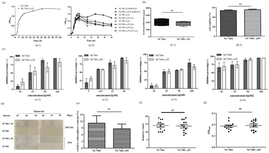 Influence of phagemid elimination on bacterial physiological and biochemical features. (a) Growth curves of NC7401 and NC7401-ΔPf in LB medium (a-1) and in CADM medium with or without 0.1 g/L of L-Phenylalanine or/and L-Alaninemedium (a-2). (b) Cereulide production of NC7401 and NC7401-ΔPf at sporulation stage (b-1) and cytotoxicity assay of HepG2 cells (b-2). (c) Sensibility assay of NC7401 and NC7401-ΔPf to different antibiotics at different concentrations. (c-1–c-4) represent inhibition rates against NC7401 and NC7401-ΔPf of ampicillin, kanamycin, spectinomycin, and streptomycin sulfate, respectively. (d) Lysis zones formed by PfNC7401 and PW4 on the bacterial lawns of NC7401 and NC7401-ΔPf, respectively. (e) Relative siderophore content comparison of NC7401 and NC7401-ΔPf using CAS method. (f) Mobility and (g) biofilm production ability of NC7401 and NC7401-ΔPf.