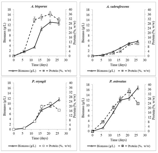 In Figure 1, protein biosynthesis versus biomass production is presented for each strain. It is noticed that protein synthesis resembled the profile of biomass production for all fungi except for A. subrufescens, where the continuous increase in proteins suggests that the biomass of this strain would have increased further if culture had been continued. For the rest of the fungi, it is observed that towards the end of the culture, while biomass was still increasing, total proteins were decreased, indicating that biosynthesis switched to other structural processes than protein synthesis. It is noteworthy that the A. bisporus strain had entered the stationary phase of growth, and this change was accompanied by a decrease in protein levels. For P. eryngii, this reduction probably indicates its transition to the stationary phase, even though a substantial amount of glucose was still present.