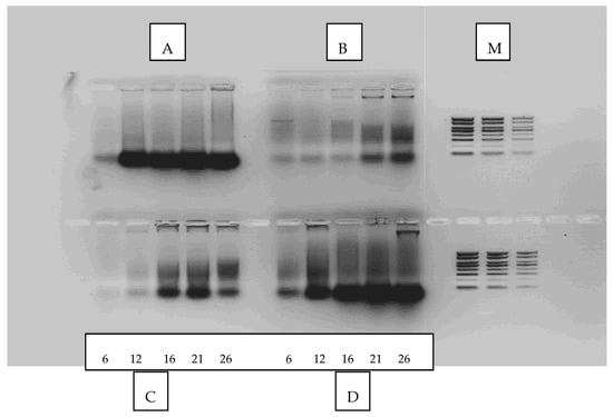 Representative electrophoresis in 2% agarose gel of crude RNA released from lysed fungal cells of (A) A. bisporus, (B) A. subrufescens, (C) P. eryngii, (D) P. ostreatus. (M) refers to DNA marker (1kb).