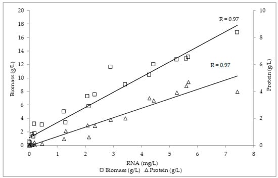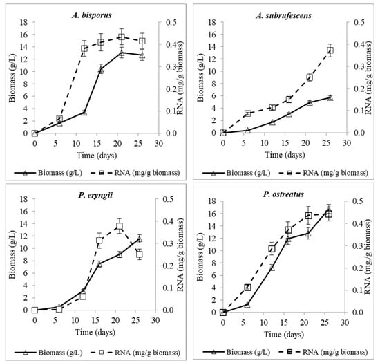 Recently, with improvements in nucleic analysis, mycelium RNA has attracted attention for the study of RNA and especially of certain fractions that are part of the total RNA content []. While there is active research on specific RNA species in fungal regulatory mechanisms, total RNA relation has not presented extensively. More recent work for growth rate and biomass relating to RNA is found with yeast cultures and algae [,]. In this study, total RNA is correlated to protein and biomass production of Pleurotus and Agaricus as an indicator of fungal growth dynamics.