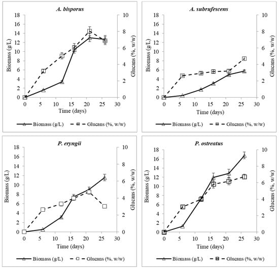 Glucans are carbohydrate ingredients of high interest due to their commercial value. Total glucan production by the four studied fungi during their liquid culture are presented in Table 1. The concentration of glucans varied among the different strains of fungi. Specifically, the maximum values (%, w/w) were observed in A. bisporus after 21 days (8%, w/w) and P. ostreatus after 26 days (6.73%, w/w) of culture. The max value of A. bisporus was significantly different to the corresponding values of the three rest fungi, while the maximum values of A. subrufescens and P. eryngii were similar (not significantly different), 4.7%, w/w and were achieved at the end of the cultivation period. Since most of the glucose is consumed during the last stages of fermentation, producing biomass, the positive correlation of glucan production with biomass production was expected (Figure 5).