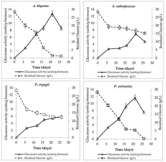 As has been already mentioned, the production of glucanases increased from the first days of cultivation when the carbon source was not a limiting factor (Figure 6). This phenomenon is observed for all fungi up to the 21st day. In the case of A. bisporus and P. ostreatus, the total glucose amount in the growth media was mostly consumed on the last day of culture, while A. subrufescens and P. eryngii had consumed around half of their glucose source at the same day.