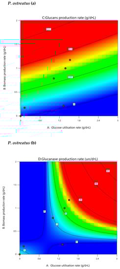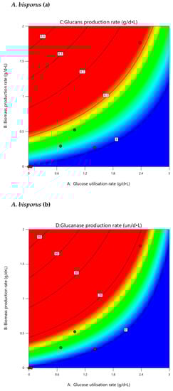 It is noticed from the data of the batch fungal cultures that there is significant variability in the production of glucans and glucanases among the studied fungi. Thus, optimization for future continuous cultures will need large-scale experimental designs that become cumbersome and costly. As a first step for optimizing future continuous production, batch-culture results were further statistically analyzed using response 3D surfaces and contour graphics to extrapolate potential culture parameters []. Results of this analysis are presented in Figure 7, where glucans and glucanases are plotted against glucose consumption and the corresponding biomass-production rate in order to determine optimal dilution and flow rates in future continuous cultures. Contours near the red areas in each studied case reflect potential increased production of glucans and glucanases in permissible conditions, indicating possible glucose concentrations and the corresponding biomass-production rate that needs to be attained. The most promising strain for the parallel production of glucans and glucanase according to contour-graphics analysis tends to be A. bisporus, exhibiting a wider flexibility in the combinations of biomass-production rate with carbon-source-utilization rate, while P. ostreatus shows the potency for the highest glucanase production of all strains. However, these observations need further experimental verification in continuous cultures.