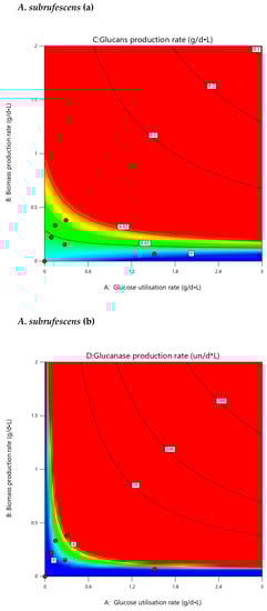 Extrapolated optimization analysis in silico was performed with Design Expert (ver. 13, 2021) []. Data obtained from the batch cultures set the basis to identify culture growth rates and carbon concentrations for optimum production of glucans and glucanases in future continuous fermentations.