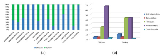 The bacterial composition of the URT at the phylum level in both chickens and turkeys was dominated by Proteobacteria, Firmicutes, Bacteriodota and Acinobacteria. In turkeys, Proteobacteria and Firmicutes were at similar levels, while in chickens, Proteobacteria predominated (Figure 1b). Actinobacteriota were more abundant in the URTs of turkeys, while in chickens, bacteria of this phylum were similarly abundant to those of Bacteroidota (Figure 1b). Out of the 14 phyla present in chickens, 9 were also present in turkeys. Those that were found only in chickens were Deinococcota, Campylobacterota, Fusobacteriota, Planctomycetota and Synergistota (Figure 1a and Figure 4a).