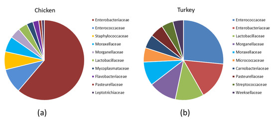 Differences in the URT microbial communities of chickens and turkeys were further analyzed at the family and genus level. Of the 40 most successfully colonizing families, 29 were common to chickens and turkeys. The other 11 families were at very different abundances in the two species or unique to one (Figure 4b). Enterobacteriaceae was the dominant family in chickens (Figure 2a and Supplementary Table S1), while in turkeys, this family was second to Enterococcaceae (Figure 2b and Supplementary Table S3). The chicken colonizing families included Leptotrichiaceae, Flavobacteriaceae, Mycoplasmataceae and Staphylococcaceae among the 10 most present; however, these families were not in the equivalent 10 which colonized turkeys. In turkeys, the Micrococcaceae, Carnobacteriaceae, Streptococcaceae and Weeksellaceae families were prominent, but they were not prominent in chickens (Figure 2b).