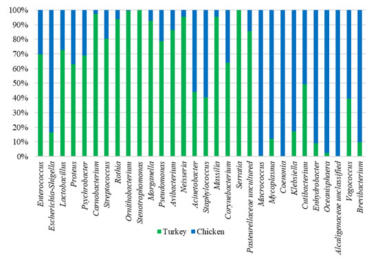 When analyzing at the genus level, among the 40 genus in the highest abundance, 25 were common to both poultry species (Figure 4c). The 20 most common genus in turkeys and chickens are shown in Figure 3. Some were found in chickens in higher abundance than in turkeys, such as Macrococcus, Mycoplasma, Klebsiella, Cutibacterium, Enhydrobacter, Oceanisphaera, Vagococcus and Brevibacterium. Others such as Coenonia and unclassified Alcaligenaceae were present only in chickens. The most frequently detected bacterial genus in chickens were Carnobacterium, Rothia, Ornithobacterium, Morganella, Avibacterium, Neisseria, Massilia and uncultured Pasteurellaceae (Figure 3). Serratia and Stenotrophomonas were only found in turkeys.