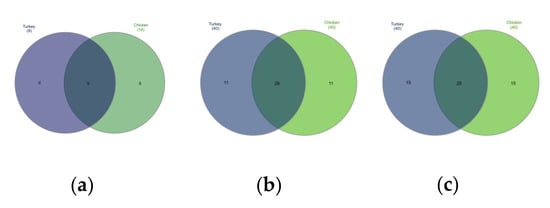 Statistical analysis was carried out using the phyloseq and vegan packages of R [34,35,36]. Alpha diversity was measured using the Shannon and Chao1 indices, and per-age- group statistical comparisons of observed richness were conducted. A beta diversity heatmap was generated based on the Bray–Curtis method [37]. Graphs were created using the heatmaply packages of R [38,39,40,41]. Venn diagrams were constructed showing the number of taxa at the phylum, family, and genus levels [42], and one way ANOVA was used to detect significant differences between assigned taxa. The Kruskal–Wallis test was performed on samples from chickens and turkeys for statistically significant differences in alpha diversity values. The value of p < 0.05 was considered statistically significant.