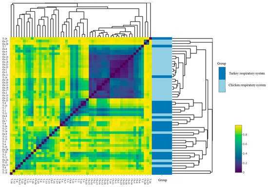 Beta diversity heatmap of chicken and turkey URT bacterial communities generated with the Bray–Curtis method.