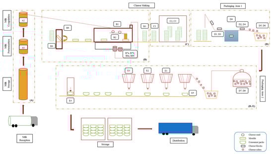 Figure 1 presents the scheme of cheese production line with highlighted sampling sites and sample codes. The production area (A) refers to the cheese vats, (B) and (C) to the mechanical tunnel and draining room, respectively, and (D) and (E) to the packaging areas. Major production steps included milk pasteurization (Sample A1), followed by the addition of rennet and starter cultures, which allowed milk coagulation and curd formation (Sample A2). Afterwards, the curd was added into molds (Samples B3 and C1), drained for 20–26 h at 13 °C (Sample C2), and cut into cubes (Sample D5). The cubes were immerged into 12% (w/v) brine for 12–72 h at 5 °C (Samples D7 and D8). Finally, the cubes were mixed with other ingredients such as oil, vegetables, and herbs (Samples E1, E2, E3, and E5), filled in “consumer pack” containers (Sample E4), and finally transported to the storage room until their distribution.