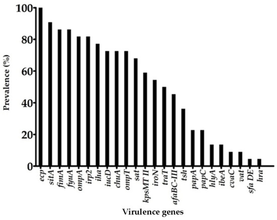 The virulence genes profiles of the strains were determined by PCR for a total of 42 virulence-associated genes, which were selected based primarily on their association with the virulence of ExPEC strains. The genes used as EPEC, EAEC, ETEC, EIEC, and STEC diagnostic markers were also included to search for possible hybrid strains. The genes were included based on Nascimento et al. [21]. All PCRs were performed following the previously described methodology.