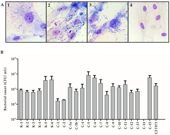 For quantitative analysis, assays were performed following the protocol used by Valiatti et al. [24] with some modifications. Twenty-four-well microplates were prepared with ~105 cells/per well, and, after 72 h of incubation, the medium contained in each well was discarded and cells were washed three times with sterile phosphate-buffered saline (PBS). Then, 1 mL of DMEM/F12 with Corneal Epithelial Cell Growth Kit and 2% BFS was added to each well and subsequently inoculated with 20 µL of each bacterial suspension containing approximately 108 colony-forming unities per milliliter (CFU/mL). After 3 h incubation at 37 °C, the growth medium was discarded, and each well was washed three times with sterile PBS. Next, cell lysis was obtained by adding 1 mL of sterile double-distilled water to each well and incubating for 30 min at 37 °C. The wells’ contents were collected, serial diluted, and plated onto MacConkey agar for bacterial counting.