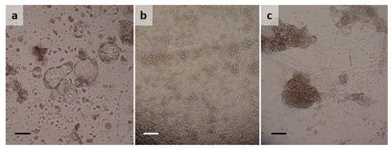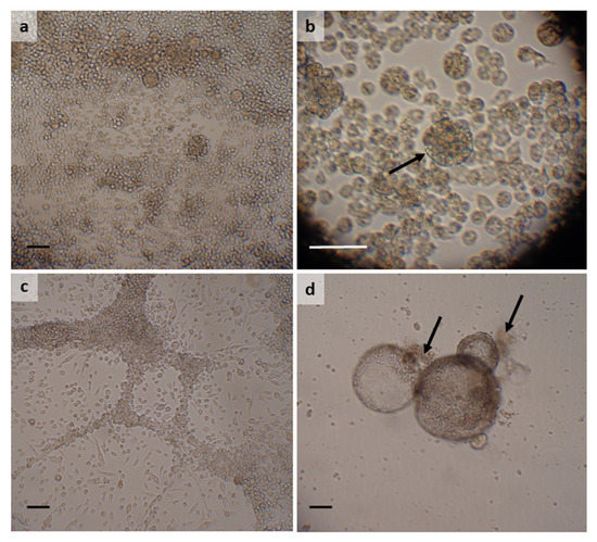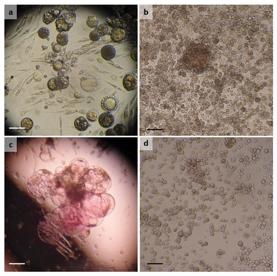Two cell lines were generated from eggs laid by ticks that were morphologically identified as I. ricinus. The first, IRE/LUAP46, was derived from eggs laid by a tick collected in September 2015 and processed approximately three months later. The primary culture was initiated in L-15 and comprised tissue clumps and a few uncrushed eggs, some of which hatched into larvae that survived for several weeks in the culture medium as shown by the observation of limb movements and midgut peristalsis visible through the larval integument. Although the tissue clumps survived, no appreciable cell growth occurred for the first two years; during the last few months of this period, medium changes were conducted every 2–3 weeks as there was little evidence of metabolism. From 26 months onwards, metabolism resumed and from 29 months floating multicellular vesicles began to appear, accompanied by increased metabolism indicated by a drop in the pH of the medium (from red to orange-yellow colour). Weekly medium changes were resumed at 31 months and the first successful subculture was carried out at 34 months (Table 2). The IRE/LUAP46 cell line, considered established at 45 months, comprises floating multicellular vesicles up to 0.5 mm in diameter (Figure 3a); although during subculture and cryopreservation the vesicles collapse, they reform within 1–2 weeks of disturbance. The 16S rRNA sequence amplified from IRE/LUAP46 DNA was 99.75% identical (100% query cover) to sequences from I. ricinus ticks from Poland (MK671589 [25]), Spain (MH645522 [26] and GU074606 [19]) and Portugal (MF370650 [34]) among others.