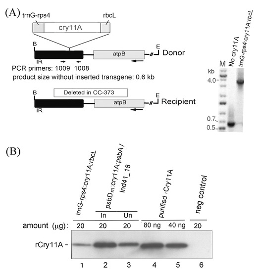 The advantages of using C. reinhardtii as the heterologous host and engineering the chloroplast genome with the toxin genes has been discussed previously [12]. We also showed that the cry11Aa gene and a truncated cry4Aa gene (cry4Aa700) could be expressed in the chloroplast at high levels and the resulting strains were toxic to mosquito larvae [12]. However, to achieve high-level expression of the cry genes, which are large proteins, we relied on an inducible system, where the transgenic mRNA was the only mRNA with a 5′ element from the psbD gene (because the endogenous psbD gene had been engineered to have a different 5′ element). This system also requires a non-wild-type host strain, Ind41_18, that has been engineered for inducible expression of the trans-factor for the psbD 5′ element, called Nac2 [15]. However, as indicated above, we need to use a robust wild-type host with more or less constitutive (chloroplast gene expression does fluctuate diurnally [16,17]) expression of the cry genes. This goal turned out to be difficult to achieve, however, and so we decided to focus on just Cry11A protein production, which is the subject of this report. Cry11A is the most potent of the Bti toxin genes [18].