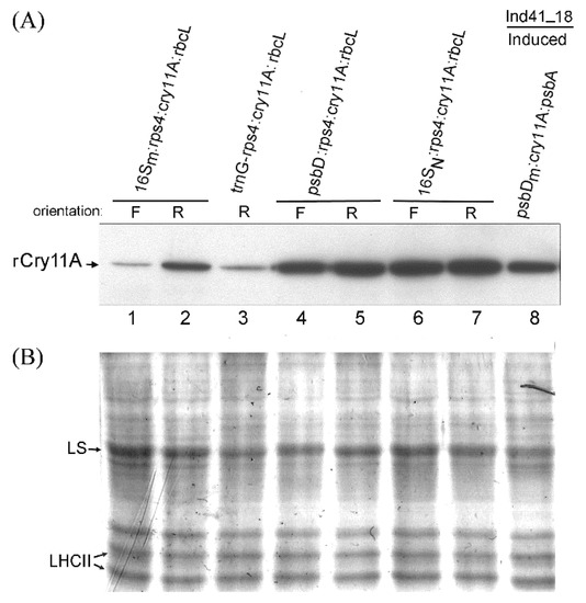 Homoplasmic transformants were obtained for each construct, and the level of rCry11A was examined by Western blot analysis of equal amounts of total protein (10 µg) for each type (Figure 4: lanes 1–2, 4–7). Protein from the previously analyzed (see Figure 2) trnG-rps4:cry11A:rbcL transformant (Figure 4, lane 3) and from our benchmark strain, psbDm:cry11A:psbA/Ind41_18 grown under inducing conditions (Figure 4, lane 8), were also included for comparison. The results show that orientation only mattered for the 16SM:rps4:cry11A:rbcL transgene, whose expression was lower than either the psbD:rps4:cry11A:rbcL or 16SN:rps4:cry11A:rbcL transgenes; the latter of which gave the highest level of rCry11A. In fact, the rCry11A production from the 16SN:rps4:cry11A:rbcL transgene in this wild-type background exceeded that of our benchmark strain (psbDm:cry11A:psbA/Ind41_18 induced) by about 50%, reaching ~0.6% of total protein. It is also remarkable that, by using the mature 5′ UTR from rps4 as the 5′ UTR, the expression level of the rCry11A protein became largely promoter-dependent, suggesting that the post-transcriptional bottleneck had been removed.