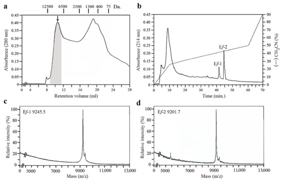 The protein material extracted from the supernatant preparations of the E. focardii cultures and initially separated on gel filtration revealed pheromonal activity, as detected by heterospecific mating induction assays, in association with only four fractions in the range from 9 to 12 kDa (Figure 1a). On reverse-phase chromatography, the protein pool of these fractions was next resolved into two major peaks (Figure 1b), each containing a single protein species as assessed by mass spectrometry analysis (Figure 1c,d). One species was measured to be 9245.5 Da, and was identified with one pheromone designated Ef-1; the second species was measured to be 9201.7 Da, and identified with a second pheromone designated Ef-2. The two proteins were quantified in the cell-culture supernatant at a concentration of 10–20 µg/L, and their co-existence provided direct evidence that their source TN1 cells carried a heterozygous allelic combination of the mat locus of the micronuclear genome, as in general is the case in wild-type Euplotes strains [9,34].
