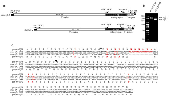 Instead, the query of the 1882-bp mac-ef-2 sequence on the E. focardii genome identified only a partial 1355-bp sequence (MJUV02014221.1) equivalent to the gene 5′-leader region. The gene validation was obtained by sequencing 1778-bp fragments from a DNA amplification run with two oligonucleotides (“5′FW2” and “3′RV” in Table 1) designed close to the gene 5′ and 3′ telomeric ends (Figure 2b).