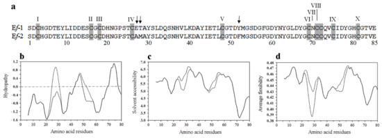 Amino acid sequence alignment and physico-chemical traits of Ef-1 and Ef-2 pheromones. (a) Sequence alignment with Cys residues, progressively numbered I to X, highlighted in grey and amino acid substitutions indicated by arrows. (b) Hydropathy, (c) solvent accessibility and (d) average flexibility plots of the Ef-1 (solid line) and Ef-2 (dotted line) pheromones, as generated by predictive algorithms [50,51,52].