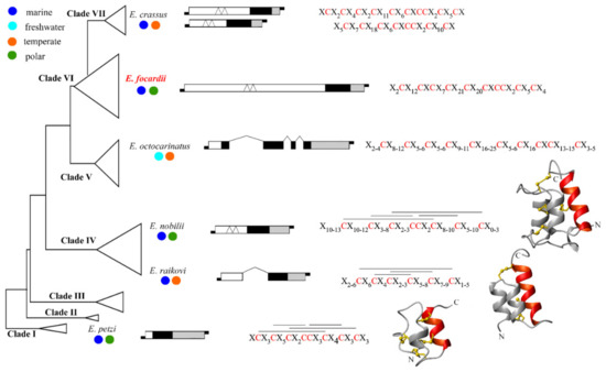 The structural characterization of E. focardii pheromones and pheromone coding genes is an initial step to outlining a picture of how these molecular structures evolve in concert with Euplotes speciation. Using a simplified version of the Euplotes phylogenetic tree commonly proposed with seven distinct clades, annotated from I to VII starting from the earliest branching one [39], Figure 4 delineates the phylogenetic relationships and ecological diversification of E. focardii and the five other Euplotes species (E. crassus, E. nobilii, E. octocarinatus, E. petzi and E. raikovi) with known pheromone and pheromone coding gene structures [12,13,19]. It appears that E. petzi (marine, polar) and E. crassus (marine, temperate) represent the two more distantly related species, the former splitting into the basal clade I and the latter into the terminal clade VII. The four other species instead separate into in-between branching clades: E. rakovi (marine, temperate) and E. nobilii (marine, polar) into clade IV; E. octocarinatus (lacustrine, temperate) into clade V including only freshwater species; and E. focardii (marine, polar) into the widest and least resolved clade VI.