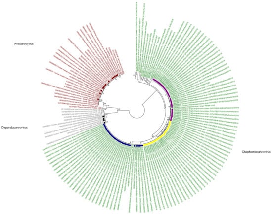 Phylogenetic tree based on amino acid sequence identity of the NS1 protein of selected parvoviruses. In red, gray, and green, the genera of Aveparvovirus, Depandoparvovirus, and Chaphamaparvovirus, respectively, are presented. The Aveparvovirus contigs constructed in this study are marked by red dots. The Depandopavovirus contigs constructed in this study are marked by black dots. Blue and yellow dots show separate branches of chaphamaparvovirus 1 (aa identity of the polyprotein between both branches is above 85%). Pink dot, chaphamaparvoviruses 2. Phylogenetic analysis was performed using the maximum likelihood algorithm based on the Tamura–Nei model with the 1000 replication bootstrap method. Only values ≥ 70% were displayed. Evolutionary analyses were conducted using MEGA X.