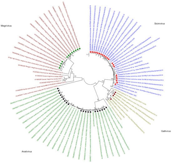 Phylogenetic tree based on the amino acid sequence identity of the polyproteins of selected picornaviruses. In red, green, olive, and blue, Megrivirus, Anativirus, Gallivirus, and Sicinivirus genera are presented, respectively. Contigs constructed in this study are marked by green (Megrivirus), black (Anativirus), purple (Gallivirus), and red (Sicinivirus) dots. Phylogenetic analysis was performed using the maximum likelihood algorithm based on the Tamura–Nei model with the 1000 replication bootstrap method. Only values ≥ 70% were displayed. Evolutionary analyses were conducted using MEGA X.