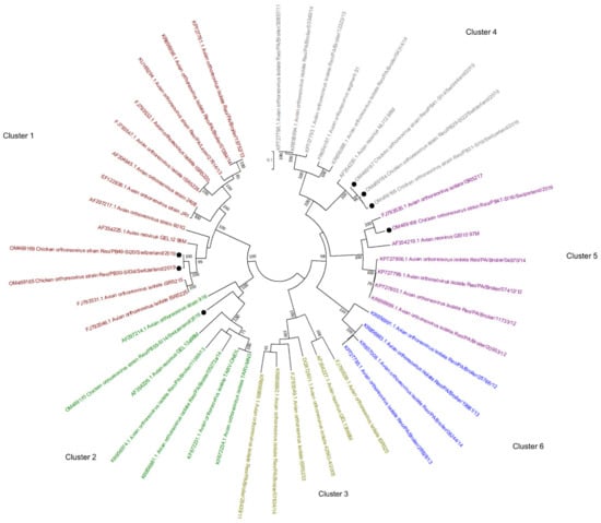 Phylogenetic tree based on the σC aa identity of selected avian orthoreoviruses. The tree shows 6 genotyping clusters in red, green, olive, blue, purple, and gray for Clusters 1, 2, 3, 6, 5, and 4, respectively. Sequences obtained in this study are marked with black dots. Phylogenetic analysis was performed using the maximum likelihood algorithm based on the Tamura–Nei model with the 1000 replication bootstrap method. Only values ≥ 70% were displayed. Evolutionary analyses were conducted using MEGA X.