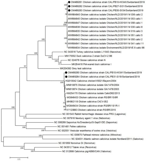 Phylogenetic tree based on the amino acid sequence identity of the polyprotein of reference strains from the genus Calicivirus, most closely related to the contigs from this study (black dots). Phylogenetic analysis was performed using the maximum likelihood algorithm based on the Tamura–Nei model with the 1000 replication bootstrap method. Only values ≥ 70% were displayed. Evolutionary analyses were conducted using MEGA X.