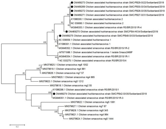 Phylogenetic tree based on the amino acid sequence identity of the Rep protein of selected chicken smaco/huchismacoviruses. Huchismacovirus contigs obtained in this study are marked with black dots. Phylogenetic analysis was performed using the maximum likelihood algorithm based on the Tamura–Nei model with the 1000 replication bootstrap method. Only values ≥ 70% were displayed. Evolutionary analyses were conducted using MEGA X.