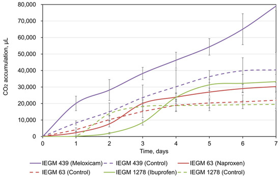 Respirometry analysis is one of the indicators of bacterial activity during biodegradation of complex organic substrates [26,28,34]. Our respirometry test data showed that the catalytic activity of rhodococci increased significantly (p < 0.05) in the presence of NSAIDs: the average values of CO2 accumulation by cells exposed to pharmaceuticals were 1.4–1.9 times higher than those in the controls (Figure 1). Interestingly, in the presence of meloxicam, no lag phase was observed for R. ruber IEGM 439 cells, while in the presence of naproxen and ibuprofen, the lag phases for all Rhodococcus strains tested were two and three days, respectively. A gradual decrease in CO2 release in the presence of naproxen (on the third day) and ibuprofen (on the fifth day) may suggest the formation and accumulation of toxic metabolites during biodegradation [28]. In addition, the maximum CO2 production was registered for meloxicam, exhibiting the highest biodegradability according to our data.