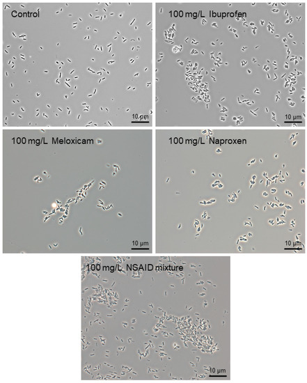 Microscopic analyses demonstrated that NSAID exposure caused morphological changes in cells, namely in their length and width, as well as a decrease in surface-area-to-volume ratios (SA/V) (Table 2).