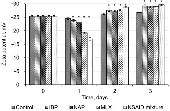 On the second and the third day of cell incubation with NSAIDs, the average zeta potential values shifted to negative values (up to −29.6 ± 0.26 mV in the presence of NSAID mixture). Apparently, this is due to redistribution of phosphatidylserine, carrying a negatively charged carboxyl group, from the inner lipid layer of the plasmalemma to the outer one [50]. The occurrence of phosphatidylserine in the outer lipid monolayer of the cell membrane is one of the early markers of apoptosis and decreased cell viability, as confirmed by fluorescence microscopy data (Figure 4). We assume that NSAIDs are likely to bind to the membrane, causing a change in membrane permeability due to the displacement of Ca2+ and Mg2+ and this leads to membrane disturbance [51]. In addition, dead or damaged cells have an enhanced leakage of charged molecules into the surroundings, increasing the zeta potential [52].