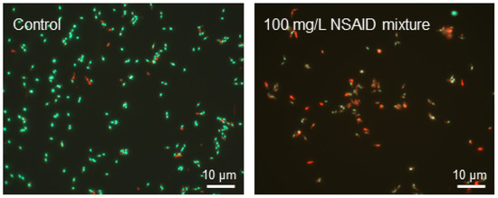 Fluorescent microscopy of R. cerastii IEGM 1278 cells grown for three days in the presence of 0.1 g/L glucose (control), or 0.1 g/L glucose and a mixture of NSAIDs. Cells were stained with LIVE/DEAD Bacterial Viability kit (live/dead = green/red, respectively).