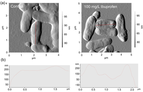 AFM (a) images and profiles (b) of R. cerastii IEGM 1278. Cells were grown for three days with 0.1 g/L glucose (control), or 0.1 g/L glucose and 100 mg/L ibuprofen.