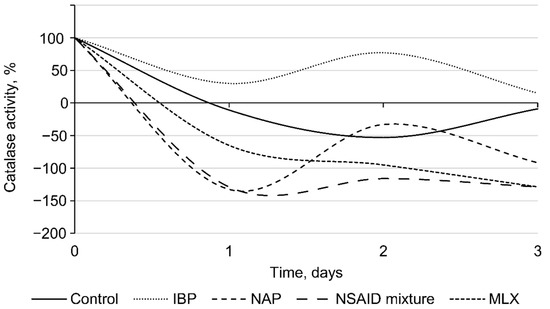 In addition, auto-aggregation is an initial prerequisite to the formation of biofilms, protecting cells against various adverse factors, including oxidative stress [53]. According to our data, NSAIDs present in the environment induced an oxidative stress in bacterial cells, as evidenced by the levels of catalase activity of rhodococci (Figure 6). The initial catalase activity of R. cerastii IEGM 1278 was 0.66 relative units corresponding to 100%. On the first day of the experiment, a decrease in catalase activity was observed for all samples. At the same time, the most significant changes (p < 0.05) were recorded in the presence of naproxen and a mixture of NSAIDs. On the second day, the catalase activity of NSAID-exposed rhodococci increased and then slightly (smoothly) declined by day three. The toxic effects of NSAIDs apparently induce the alternate involvement of enzymatic (catalase) cell protection and an alternative non-enzymatic system (polysaccharides, trehalose mycolates), allowing for optimal allocation of resources and nutrients, while making it possible not to spend them consistently on the energy-consuming process of synthesis of antioxidant enzymes. To put it another way, when the cell wall is intact, it protects bacteria from oxidative stress adequately, but when the cell wall is destabilized, enzymes, particularly catalase, are responsible for efficient defense against oxidative stress [33]. In our case, on the second day, an increase in catalase activity was observed, which is probably associated with induced cell permeability, cell damage, and an increase in zeta potential (see Figure 3 and Figure 4).