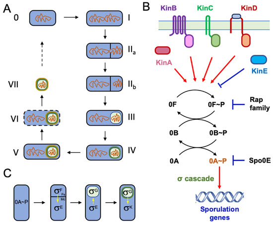 The discovery that Bacillus species are capable of forming endospores can be traced back to almost a century and half ago when it was first documented by Cohn and Koch in 1876 [9,10]. Nowadays, the multiple stages (0 to VII) of endospore development have been described in detail based on morphological distinction and application of cell biology approaches (Figure 1A) [1,11]. Hundreds of genes involved in endospore formation have been characterized and categorized based on their functions in specific sporulation stages [12]. Differentiation into spores is triggered by nutrient starvation. Several sporulation kinases sense various environmental or cellular signals linked to nutrient status, and collectively activate the sporulation master regulator Spo0A through protein phosphorylation (Spo0A~P), either directly or via a phosphorelay (Figure 1B) [13]. A number of phosphatases (Spo0E and the Rap family) are also involved in modulating the phosphorelay and Spo0A phosphorylation levels, providing a way for integration of multiple signals in this decision-making process [13]. Rising Spo0A~P activities lead to activation of the first sporulation sigma factor F (σE) in the forespore, followed by sequential activation of several other alternative sigma factors (σE, σG, and σK) in either the mother cell or the forespore compartment (Figure 1C). Each sigma factor controls a set of genes that function during specific sporulation stages [12]. The genetic pathway governing sporulation in B. subtilis can be better described as a temporally and spatially orchestrated expression of a network of genes. Even though studies to characterize genes important for sporulation have been carried out for several decades, new sporulation genes are being identified with novel techniques and sometimes under altered sporulation conditions [14].