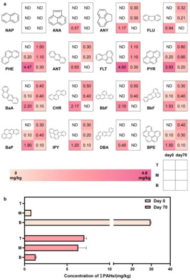 Concentrations of 16 PAHs (a) and total PAHs (b) in coking site soils sampled at depths of 0–10 cm (T: top layer), 10–30 cm (M: middle layer), and 30–100 cm (B: bottom layer) on Day 0 (in light color) and Day 70 (in dark color). Average concentration per kind of PAH is labeled in the corresponding cell and ND denotes not detected.