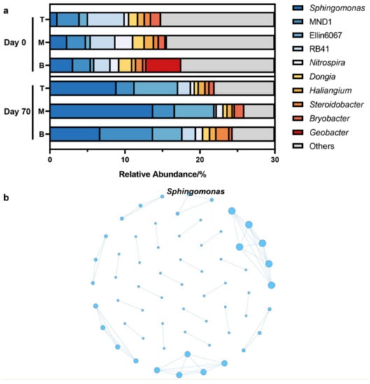 The spatial distribution pattern and temporal variation of Sphingomonas were consistent with those of the PAHs. On Day 0, the relative abundance of Sphingomonas and the concentration of PAHs gradually increased from the top layer to the bottom layer. On Day 70, with the migration of PAHs from the bottom layer to the middle and top layers, the concentration of PAHs in bottom layer was lower than that in the middle and top layers, and the relative abundance of Sphingomonas was also higher in the middle and top layers than that in bottom layer. There have been similar reports that Sphingomonas is distributed with the spatial distribution of toxic substances. For example, Isoproturon (IPU), commonly used in farmlands, remains in the soil and migrates to the bottom layer along with surface water and groundwater. The biodegradation of IPU was detected in the soil and a spatial variation in the biodegradation rate of IPU was found. This spatial variation was the result of a combination of microbial degradation (Sphingomonas spp.) and soil pH [].