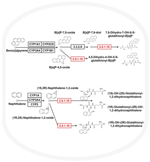 We obtained the Sphingomonas sp. genome with completeness of 98.57% and contamination of 2.61. Circos v0.69 (http://circos.ca/, accessed date, 18 June 2021) software was used to draw the genome circle map (Figure S1). We found that Sphingomonas sp. contained 4110 predicted genes. The genome size was 2.52 Mb and the GC content was 67.70%. The gene density was 0.94 genes per kb, and the average gene length was 953.34 bp. Twenty tRNA genes and two sRNA genes were identified in the genome. A variety of genes related to the metabolism of aromatic compounds, PAH metabolism, and P450 metabolism were found in the genome sequence of Sphingomonas sp., which is the reason why Sphingomonas sp. can effectively degrade PAHs. Fifteen genes were related to the metabolism of cytochrome P450 to xenobiotics, ten genes were related to the degradation of aromatic compounds, and three genes were related to the degradation of PAHs. The genomic data (Figure 3) indicated that Sphingomonas sp. possessed a metabolic pathway that mediated naphthalene degradation—(1S,2R)-Naphthalene 1,2-oxide + Glutathione <=> (1S)-Hydroxy-(2S)-glutathionyl-1,2-dihydronaphthalene reaction, (1R,2S)-Naphthalene 1,2-oxide + Glutathione <=> (1R)-Hydroxy-(2R)-glutathionyl-1,2-dihydronaphthalene reaction—and a benzo[a]pyrene degradation pathway—Benzo[a]pyrene-4,5-oxide + Glutathione <=> 4,5-Dihydro-4-hydroxy-5-S-glutathionyl-benzo[a]pyrene reaction, Benzo[a]pyrene-7,8-dihydrodiol + Glutathione <=> 7,8-Dihydro-7-hydroxy-8-S-glutathionyl-benzo[a]pyrene + H2O.
